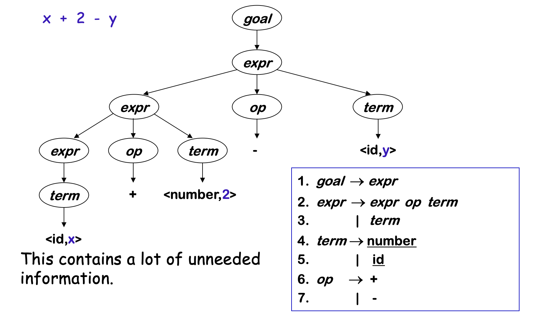 - The AST summarizes grammatical structure, without including detail about the derivation