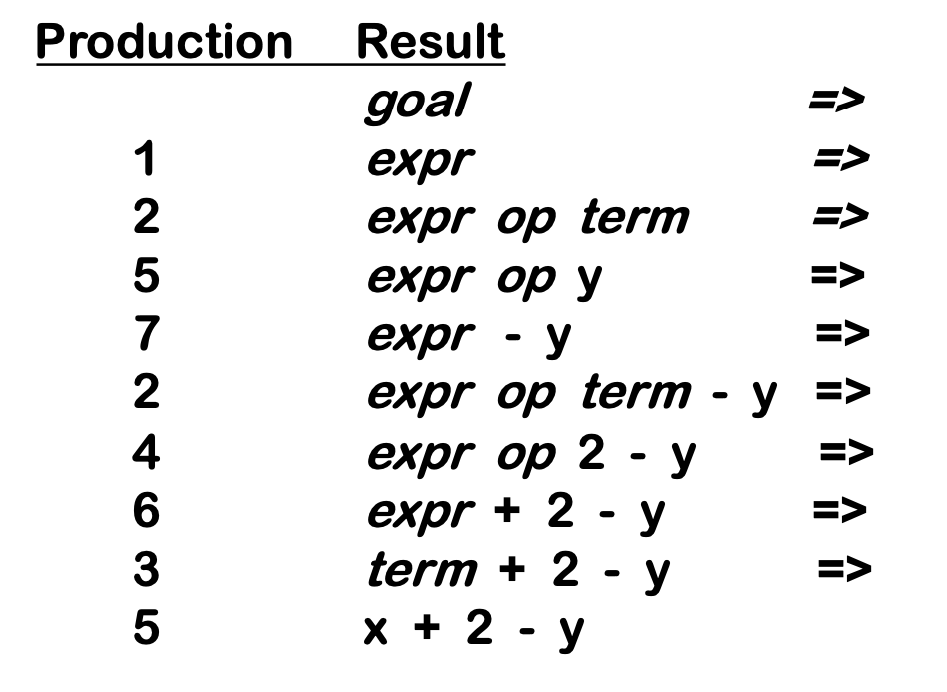P = { 1, 2, 3, 4, 5, 6, 7 }- This grammar defines simple expressions with addition & subtraction over “number” and “id”