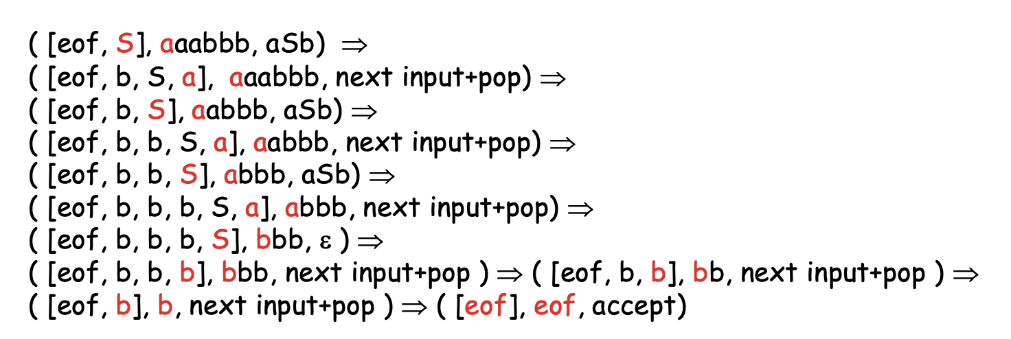 Describe action as sequence of states (PDA stack content, remaining input, next action), use eof as bottom-of-stack marker
