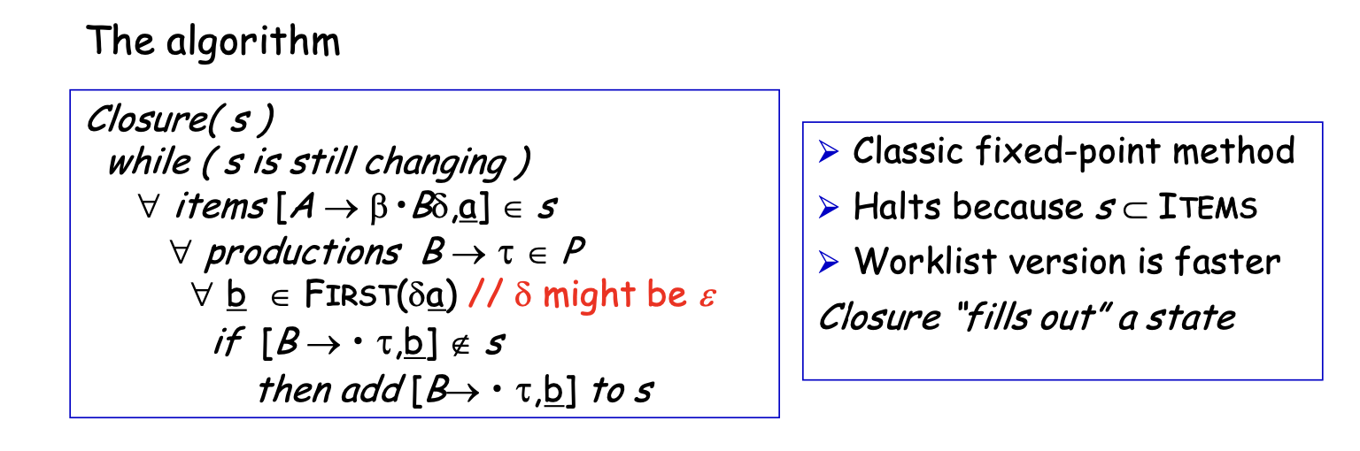 - Any item [A -> 𝝱·Bφ, a] implies [B -> ·𝛕, x] for each production with B on the lhs, and each x ∈FIRST(φa)