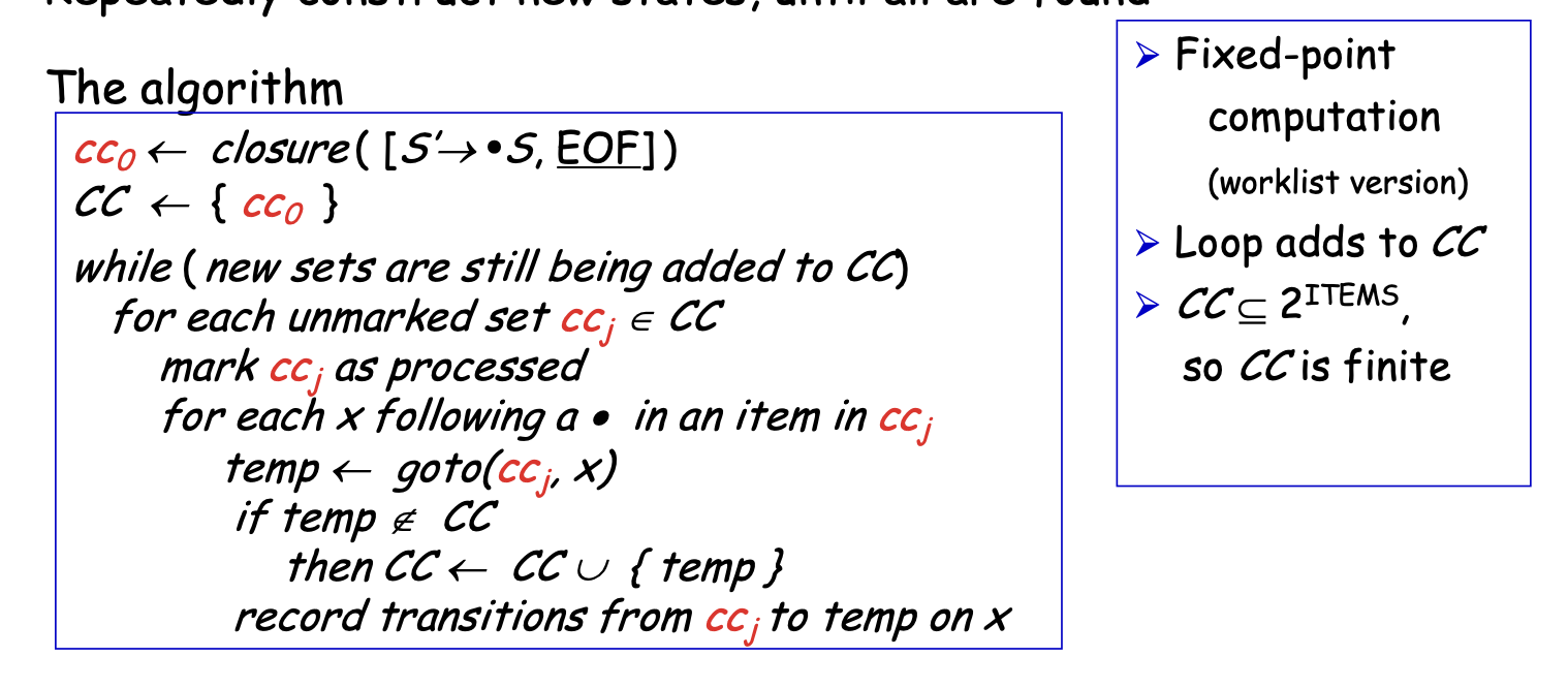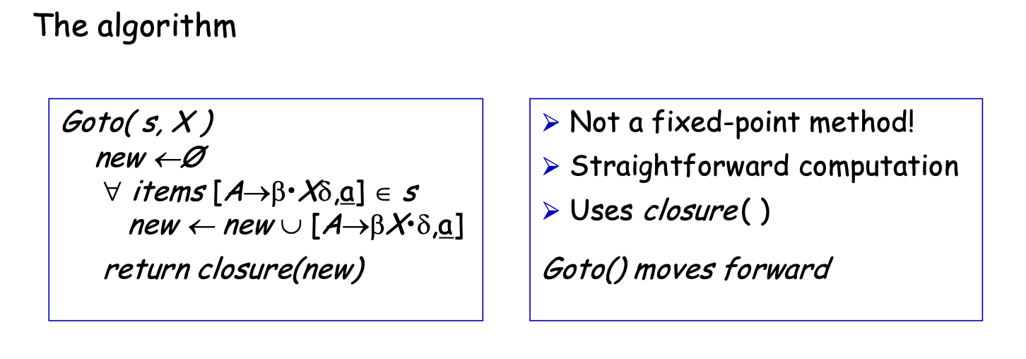 - Goto({ [A -> 𝝱·Xφ, a]}, X) produces [A -> 𝝱X·φ, a] (easy part)