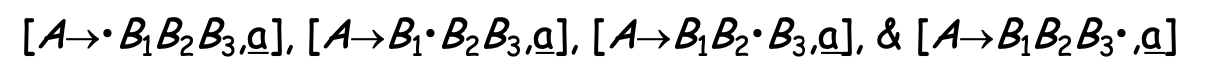 - [A -> 𝝱.𝝲, a] means that the input seen so far is consistent with the use of A -> 𝝱𝝲 at this point in the parse, and that the parser has already recognized 𝝱