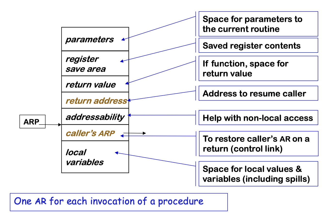 - Ensures that each procedure inherits a valid run-time environment and that the callers environment is restored on return