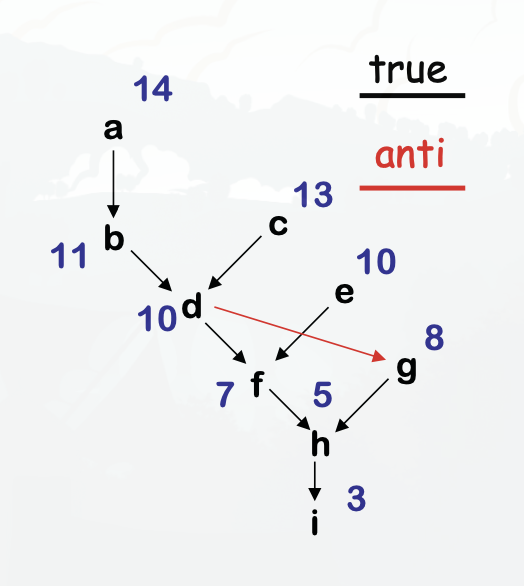 | 6 | f | g | Remove d form the active set, and add f and g to the ready set. We schedule g first because it has a higher latency-weighted path. |